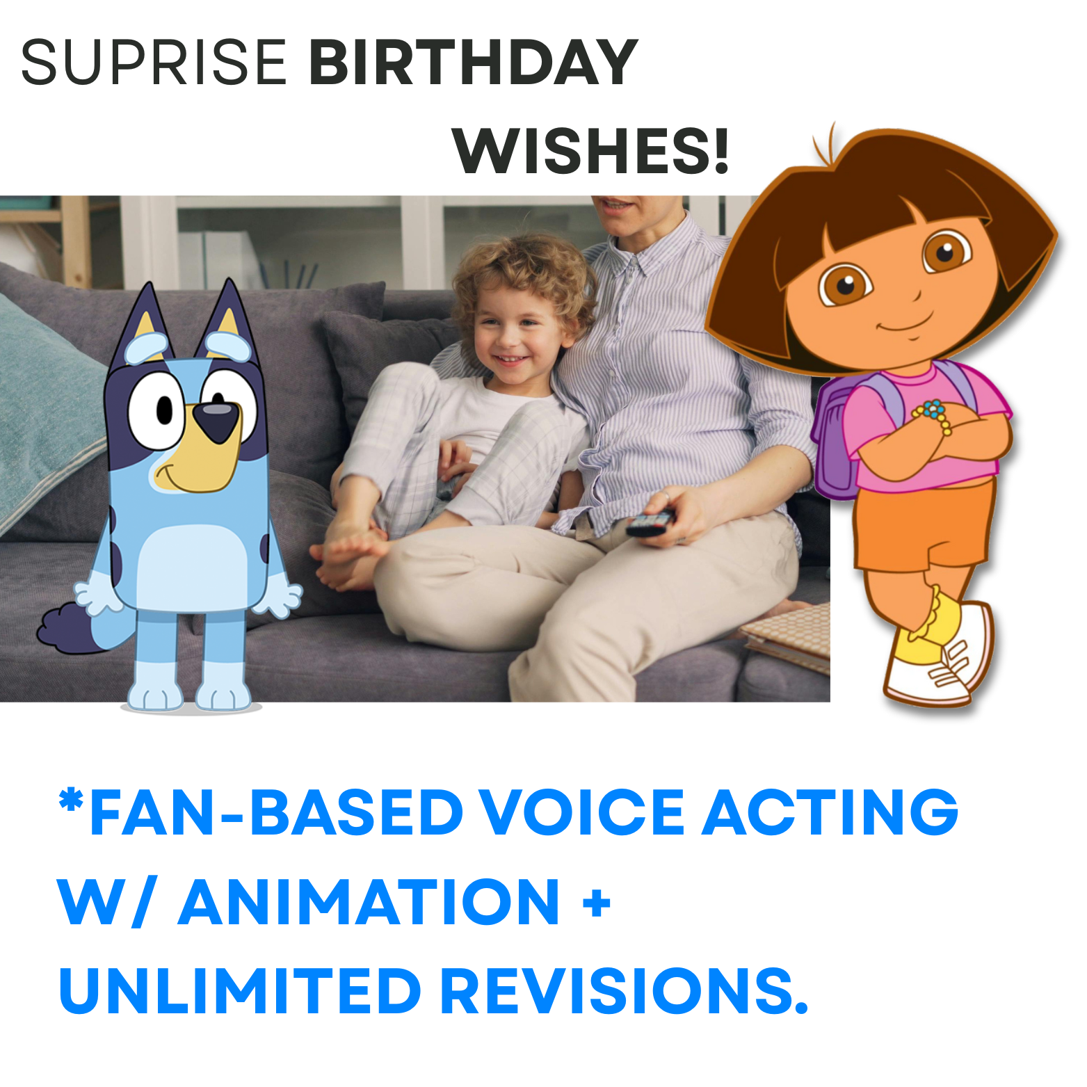 Each birthday clip we create is a short, custom video (about 30 seconds) that combines limited reference material with original animation. The opening seconds may show characters in their recognizable design and include brief clips from the shows for context. This is used only to provide a familiar introduction that the child is used to seeing or hearing. After this short intro, the video transitions into an original animation created entirely by us, designed to deliver the personalized birthday surprise.